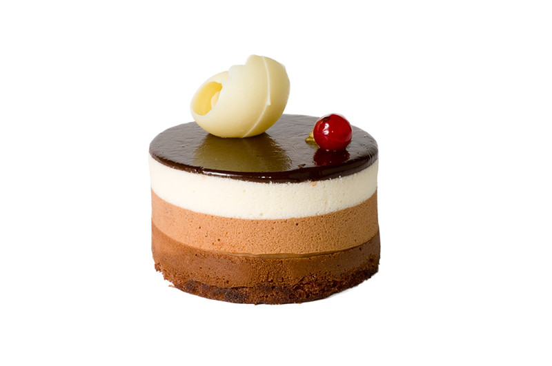 Mousse cremoso y esponjoso de chocolate negro, chocolate con leche y chocolate blanco, sobre una base de bizcocho de chocolate negro, y terminado con glacaje de chocolate amargo. Producto congelado elaborado mediante procesos artesanales, peso aproximado 100 gr./unidad.