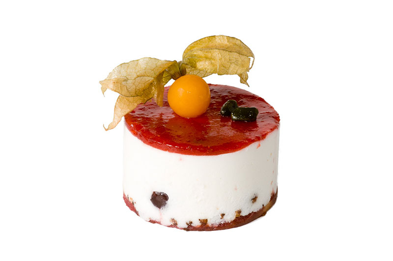 Pastel de mousse de queso con cerezas, cubiertocon gelatina de frambuesa y decorado conphysalis y pistachos. Producto congeladoelaborado mediante procesos artesanales, pesoaproximado 100 gr./unidad.