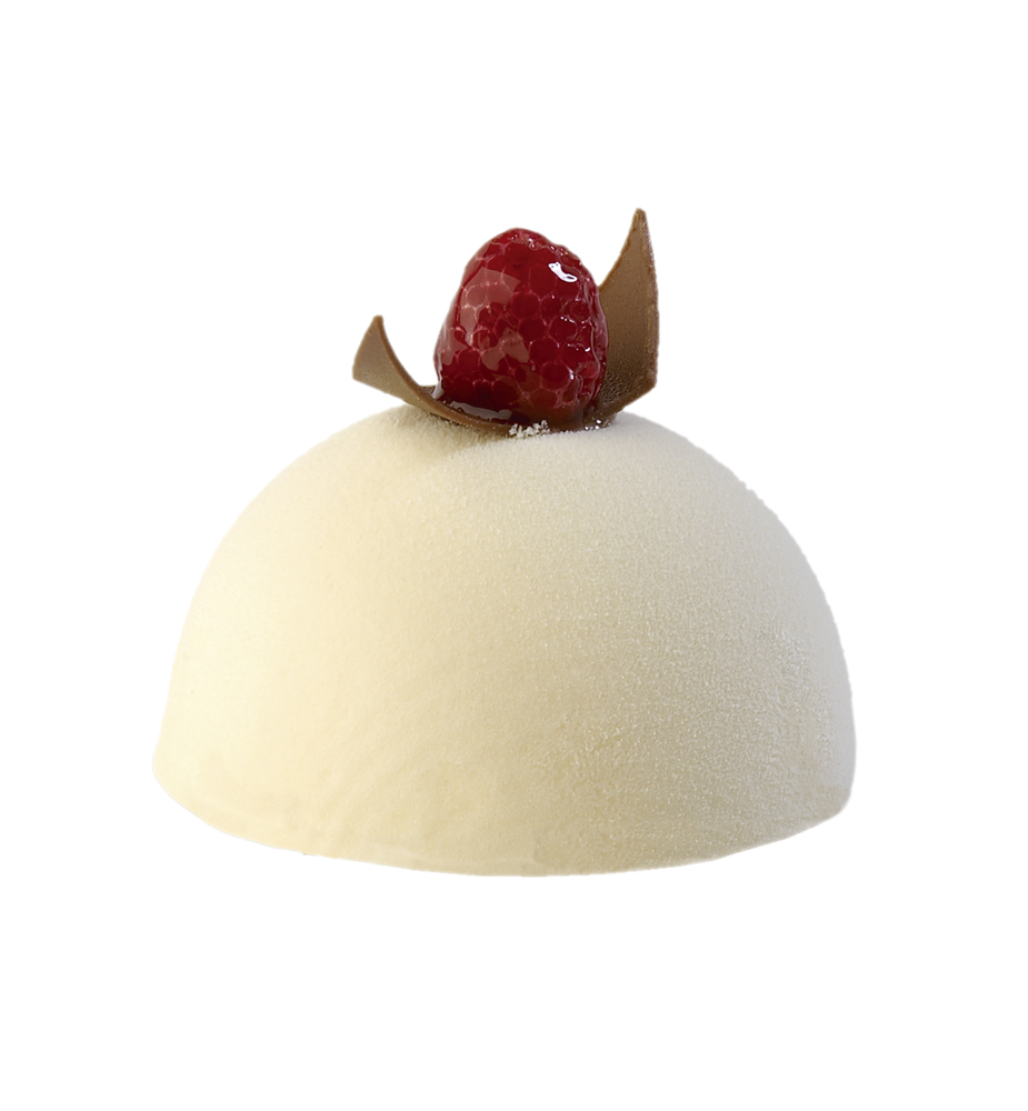 Mousse de chocolate blanco con núcleo decremoso de frambuesa. Producto congeladoelaborado mediante procesos artesanales, pesoaproximado 70 gr./unidad.